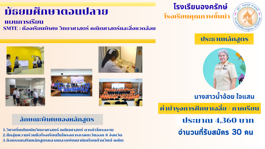 มุ่งเน้นเพิ่มเติม ด้านวิทยาศาสตร์ คณิตศาสตร์ เทคโนโลยี และสิ่งแวดล้อม โดยการทำโครงงาน และใช้กระบวนการวิจัยในการเรียนรู้ และเสริมสร้างการเป็นนวัตกร