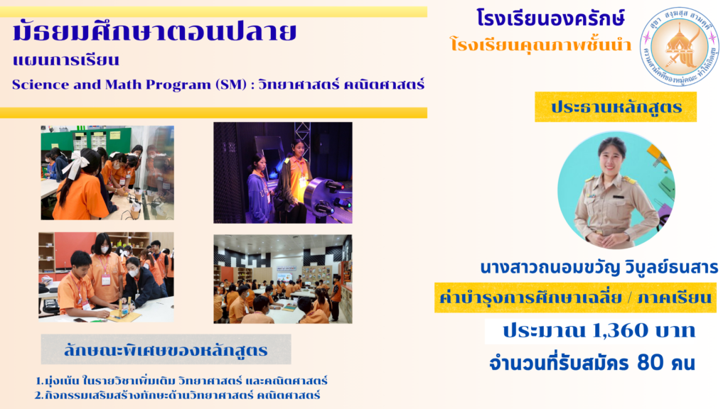เน้นเพิ่มเติมรายวิชาด้านวิทยาศาสตร์ และคณิตศาสตร์ สำหรับนักเรียนที่มีความสนใจ และต้องการเพิ่มเติมความรู้ และทักษะเพื่อการศึกษาต่อ ด้านวิทยาศาสตร์ ในระดับอุดมศึกษา