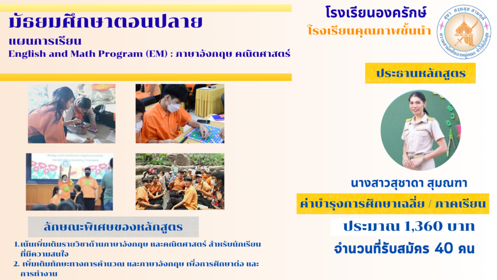 เน้นเพิ่มเติมรายวิชาด้านภาษาอังกฤษ และคณิตศาสตร์ สำหรับนักเรียนที่มีความสนใจ และต้องการเพิ่มเติมทักษะทางการคำนวณ และภาษาอังกฤษ เพื่อการศึกษาต่อ และการทำงาน