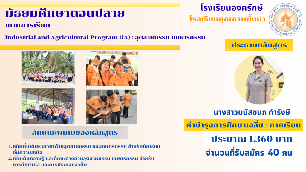 เน้นเพิ่มเติมรายวิชาด้านอุตสาหกรรม และเกษตรกรรม สำหรับนักเรียนที่มีความสนใจ และต้องการเพิ่มเติมความรู้ และทักษะทางด้านอุตสาหกรรม เกษตรกรรม สำหรับการศึกษาต่อ และการประกอบอาชีพ