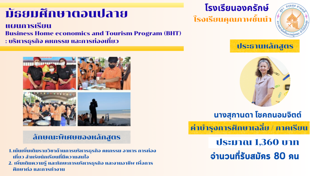 เน้นเพิ่มเติมรายวิชาด้านการบริหารธุรกิจ คหกรรม อาหาร การท่องเที่ยว สำหรับนักเรียนที่มีความสนใจ และต้องการเพิ่มเติมความรู้ และทักษะการบริหารธุรกิจ และงานอาชีพ เพื่อการศึกษาต่อ และการทำงาน